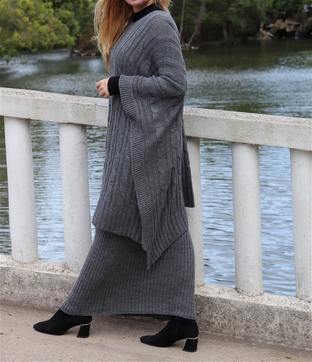 Ensemble robe débardeur, col en V, coupe droite, grosse maille + pull poncho, coupe large, boutons décoratifs au niveau des manches coupées, maille torsadée.