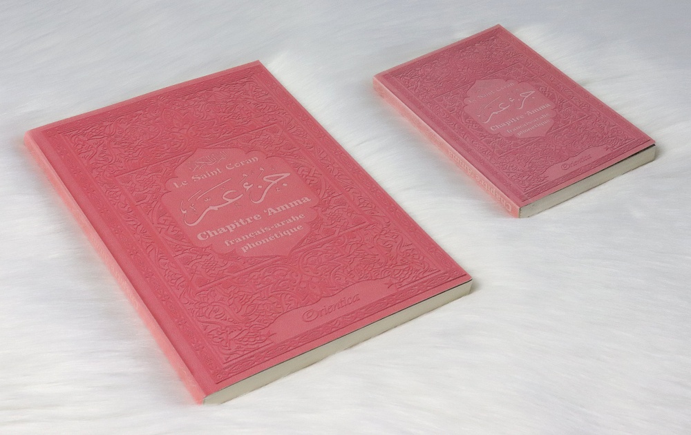 Couverture rose pale. Contient Juz' 'Amâ complet : Hizb 'Amma et Hizb Sabih avec toutes les petites sourates du Coran.