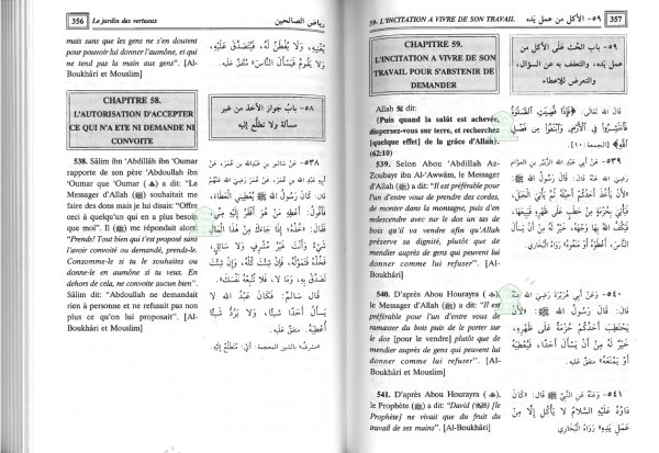 Dans la même page les 2 textes : arabe dans la moitié droite et sa traduction en français dans la moitié gauche (voir photo).