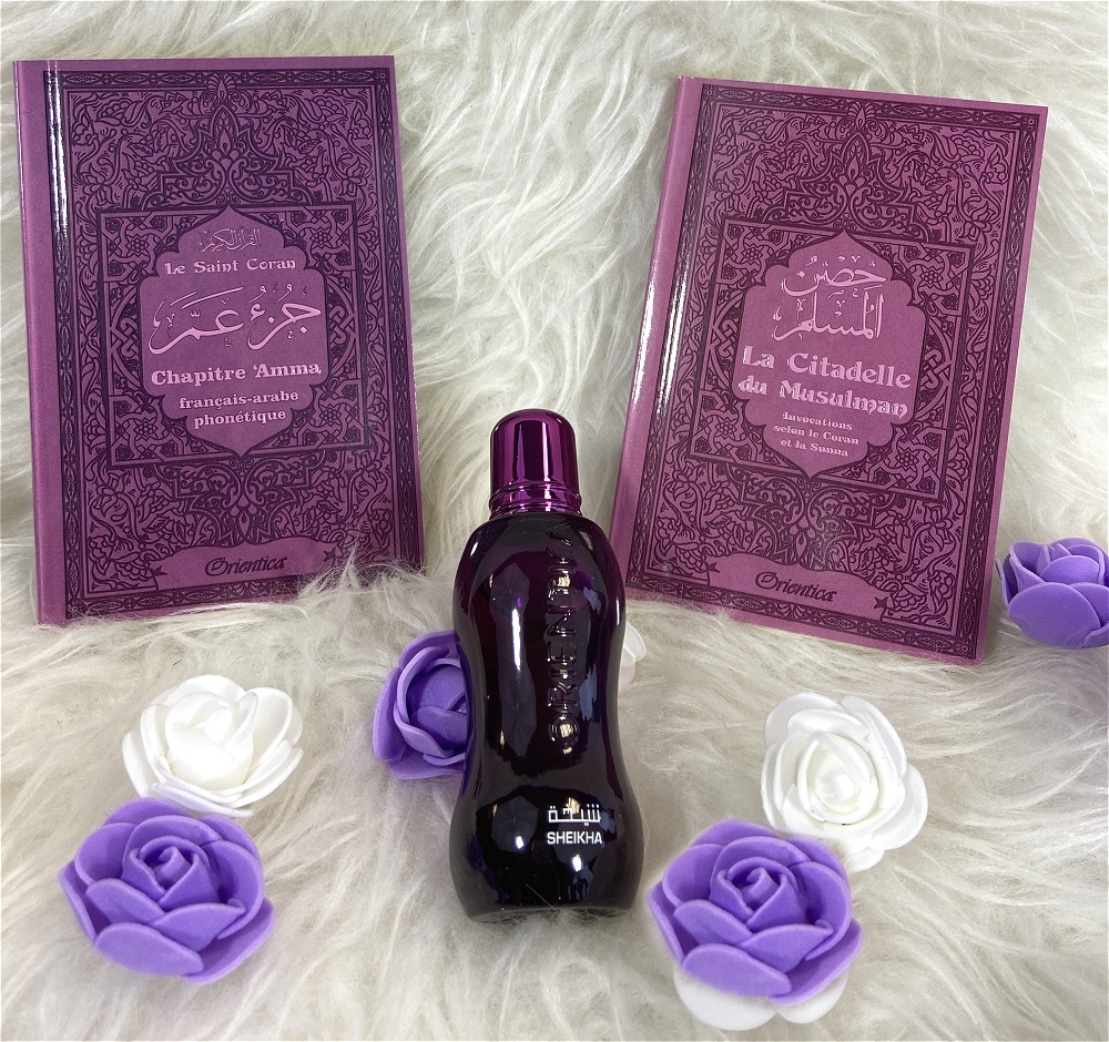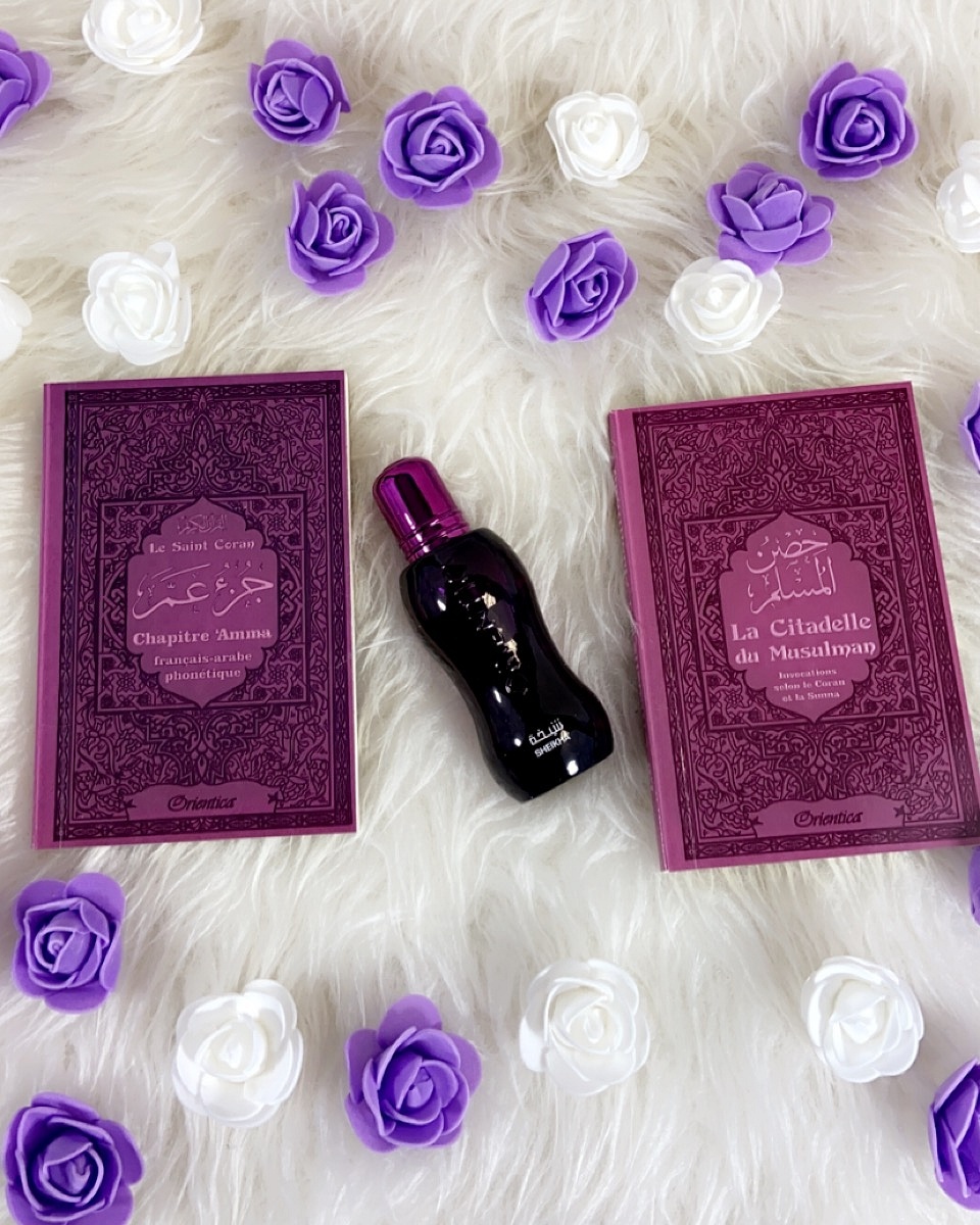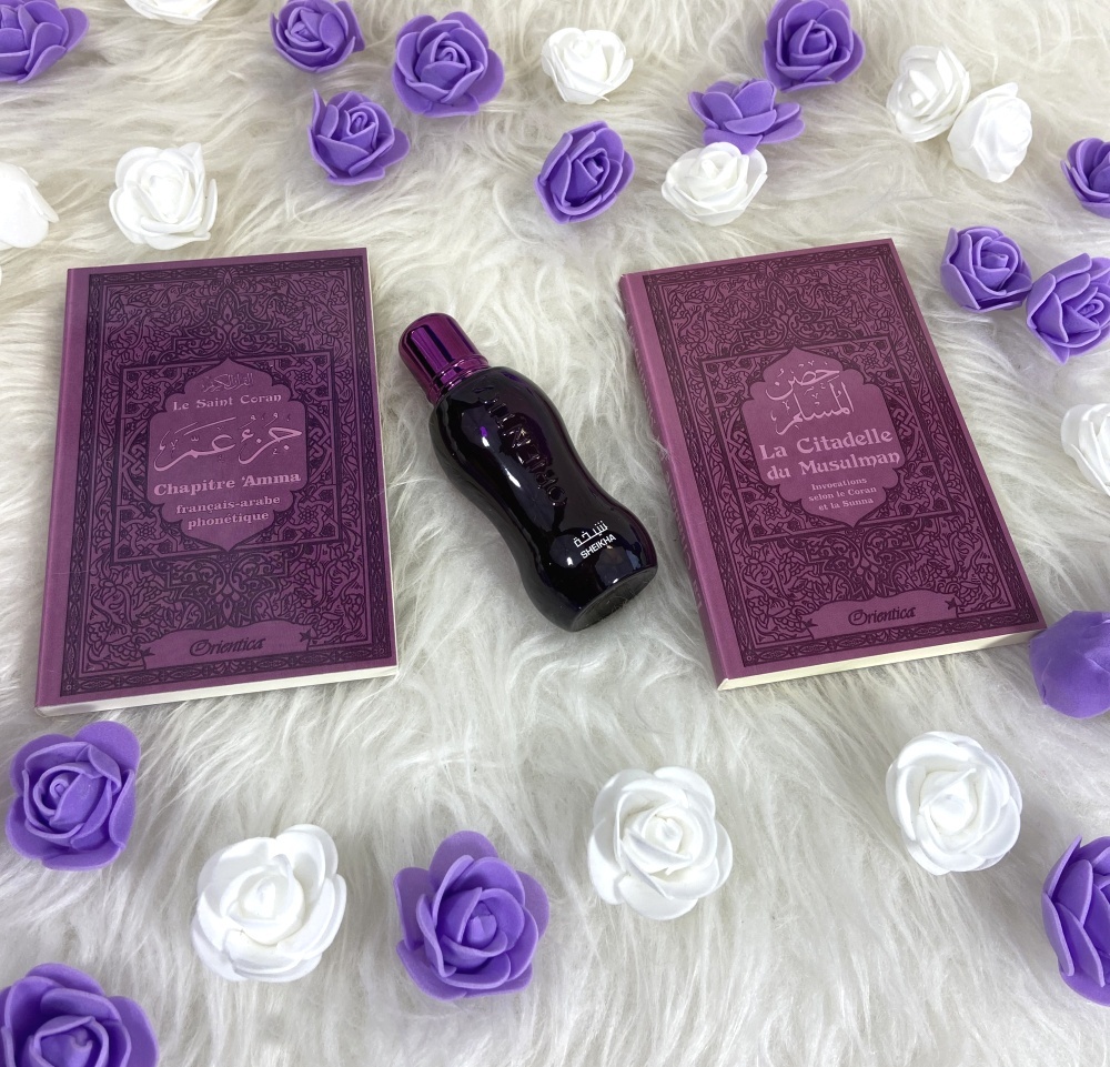 Pack cadeau musulman pas cher de couleur mauve avec 2 livres "Les 40 hadiths" et "La Citadelle du musulman" (bilingues français/arabe) - Parfum deluxe - Sac cadeau - REF. 26976 (9.00 €)