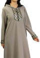 Robe longue type abaya marocaine pour femme avec capuche et motifs dorés - Couleur taupe - REF. 28638 (29.00 €)