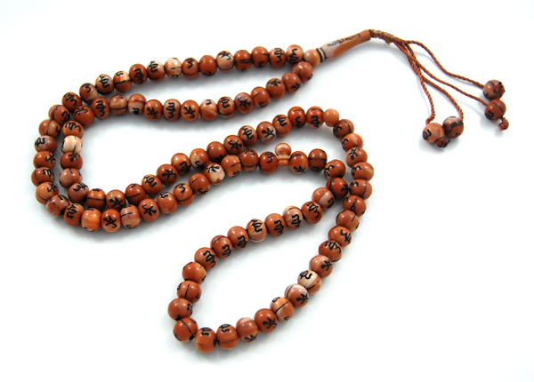 Chapelet "Sebha" 99 grains couleur marbre marron clair avec les noms d'Allah et du Prophète Muhammad (SAW) sur chaque grain. Un séparateur est placé tous les 33 grains.