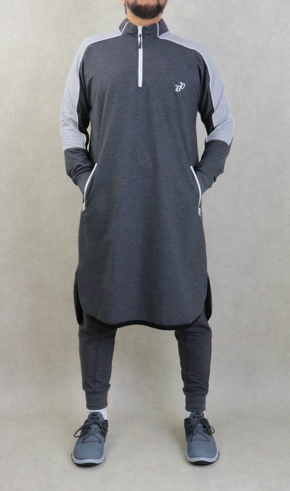 Qamis court, tissu épais molletonné qui tient chaud ultra confortable et doux. Fermeture zippé au niveau de la poitrine. Deux poches zip blanches sur les côtés. Parties gris clair chiné au niveau des épaules et des bras. Légèrement plus long derrière que devant. Brodé logo BU (Best Ummah).