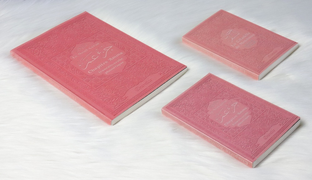 Pack cadeau constitué des trois livres de couleur rose claire assortie : La Citadelle du Musulman de poche et Le Saint Coran Chapitre Amma en deux tailles différente : format de poche et grande taille.