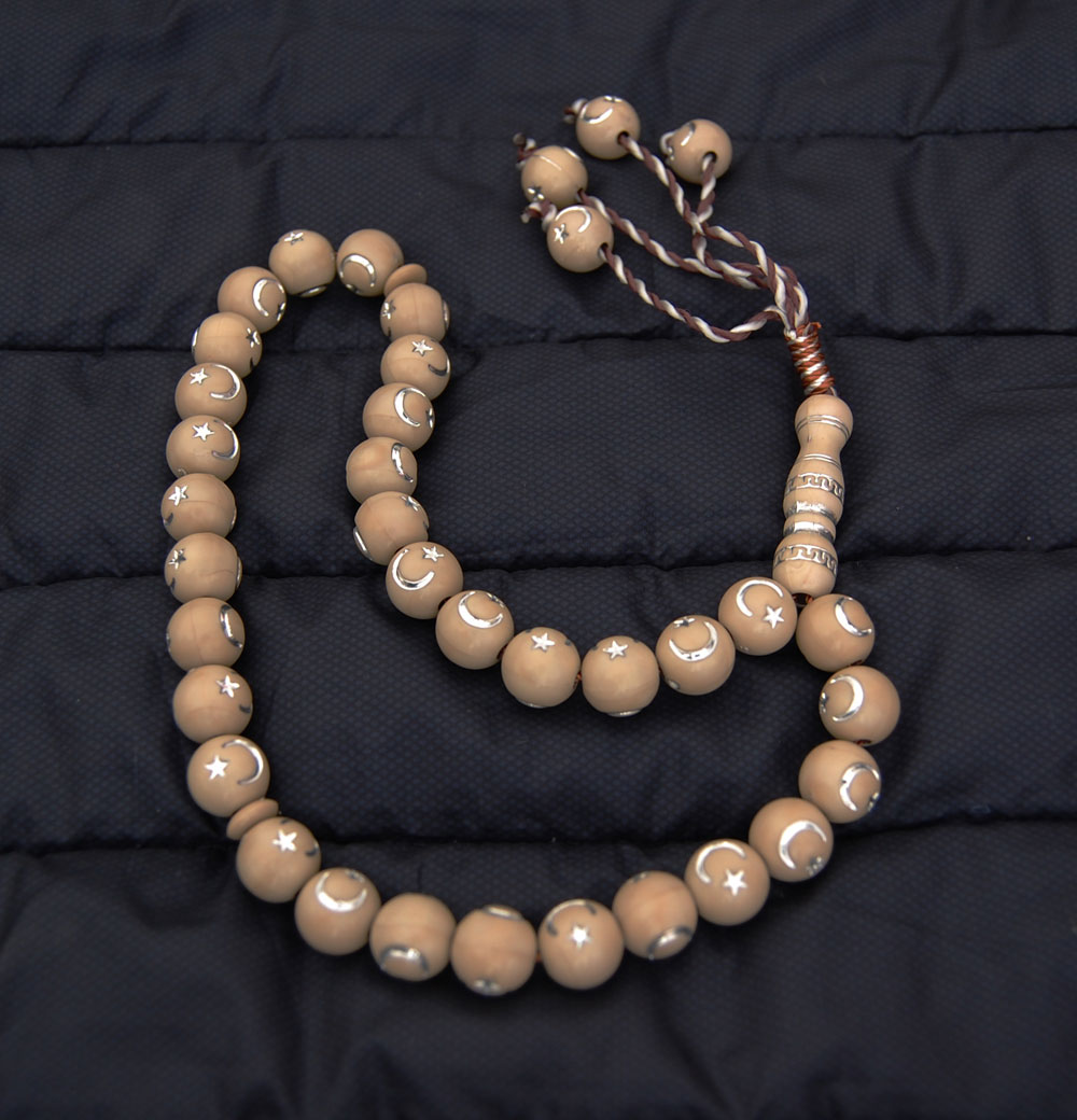 Chapelet "Sebha" beige a 33 grains avec motifs argentes