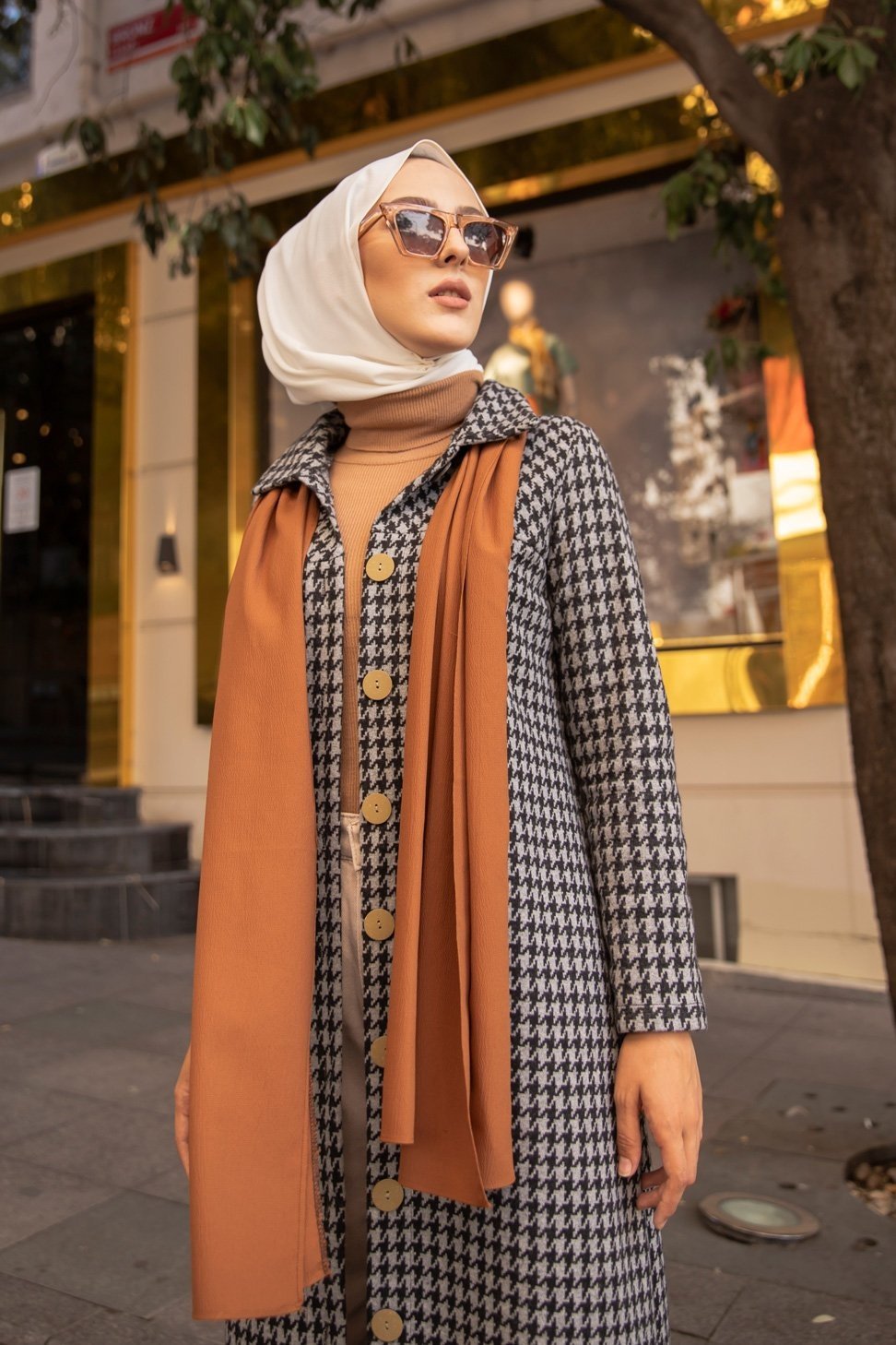 Tunique longue boutonnee a carreaux pour femme (Vetement Hijab Automne-Hiver) - Couleur gris