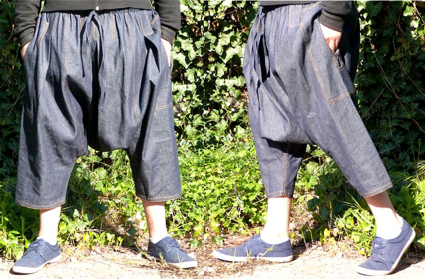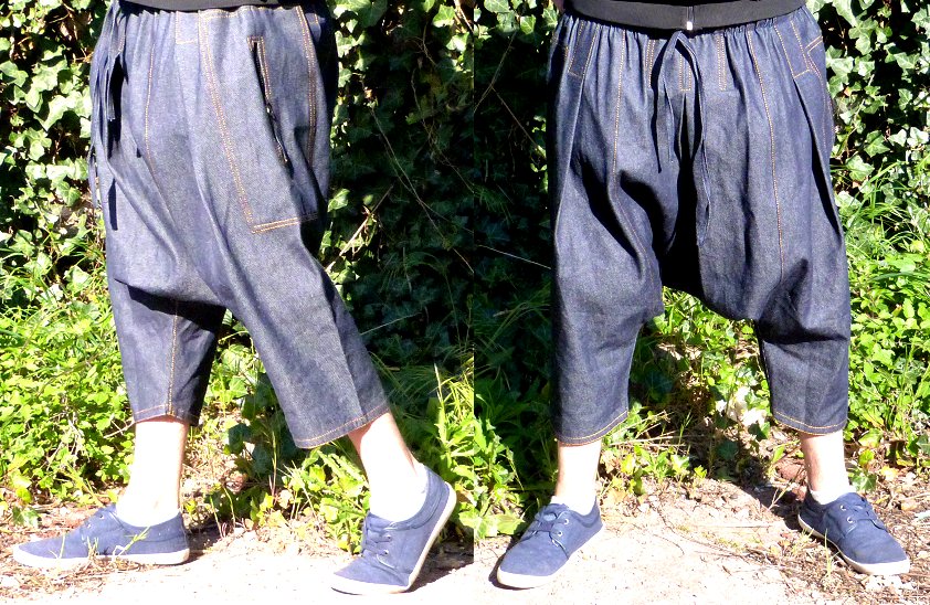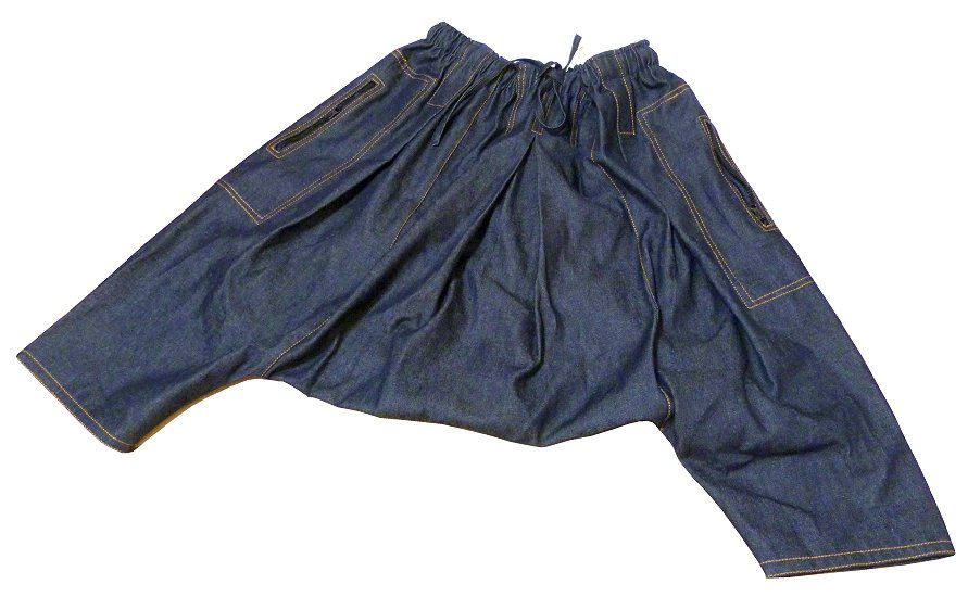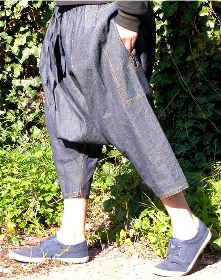 Sarouel pantalon jeans (black Jean) avec ceinture élastique avec cordon. Deux grandes poches latérales à fermeture zip.