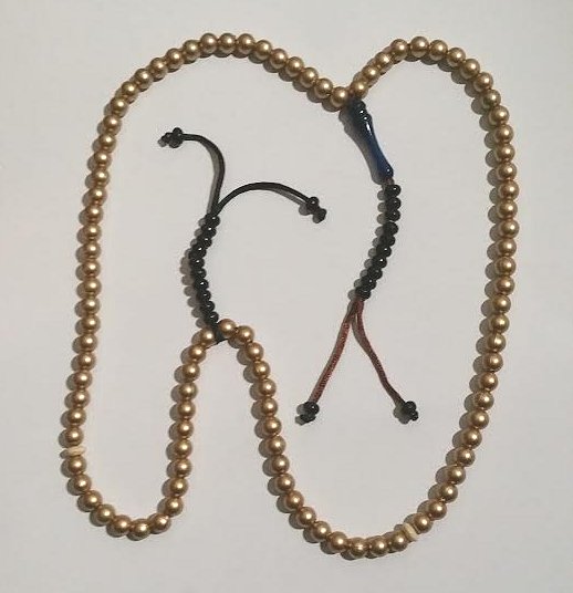 Chapelet (Sabha) à 99 perles dorées avec 2 séparateurs et 2 ponpons-compteurs à petites billes noires.