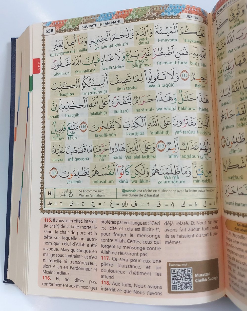 Les règles de tajwid sont données par un système de couleur intuitif pour apprendre les règles de lecture et de psalmodie du Saint Coran et le code QR (présent sur chaque page) permet d'ouvrir une vidéo sur son smartphone et d'écouter et suivre la lecture du Coran par cheikh Soudays.