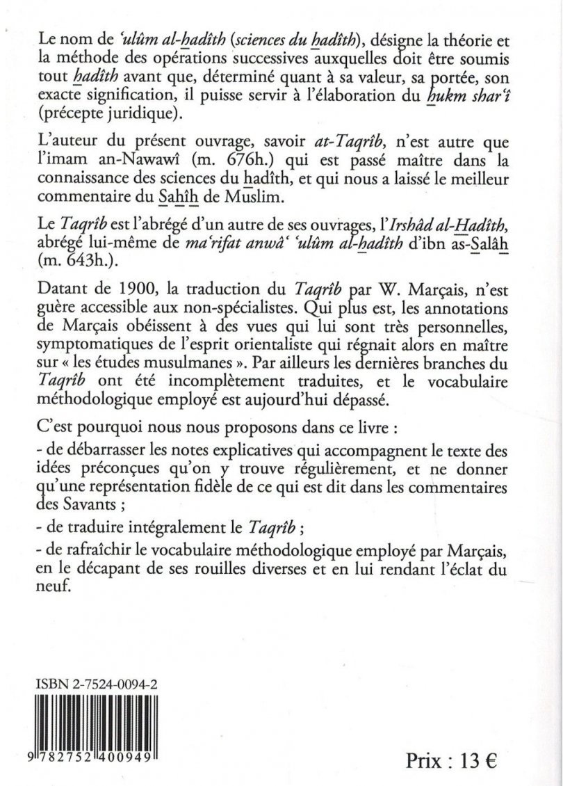 Ce livre été intégralement traduit et annoté jusqu’à la trente-neuvième branche par W. Marçais. Mais, outre que cette traduction qui date de 1900, et a été publiée dans le Journal asiatique en plusieurs parties, entre septembre de l’année 1900, et août de l’année 1901, elle n’est guère accessible aux non-spécialistes. Tout cela rend cette œuvre, par ailleurs remarquable, peu utile aux lecteurs, qu’ils soient désireux, comme le commun, d’étendre leur culture générale, ou aient envie, comme les étudiants, d’approfondir leurs connaissances spéciales. Nous nous proposons donc dans cette traduction de :