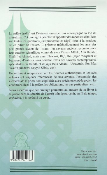 La prière est l'élément essentiel qui accompagne la vie du musulman. Cet ouvrage a pour but d'apporter des réponses détaillées sur toutes les questions jurisprudentielles (fiqh) liées à la pratique de ce pilier de l'Islam.