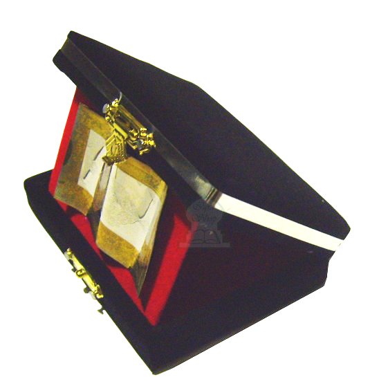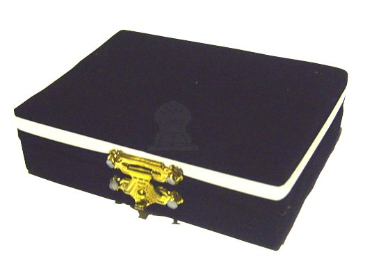 Boite en velours contenant une plaque métallique gravée avec des versets coraniques. Photo non contractuelle.