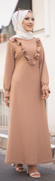 Très jolie abaya en tissu satiné et manches en matière élasthanne. Le tout décoré de strass brillants dorés et assorti d'un châle. Coupe evasée vers le bas.