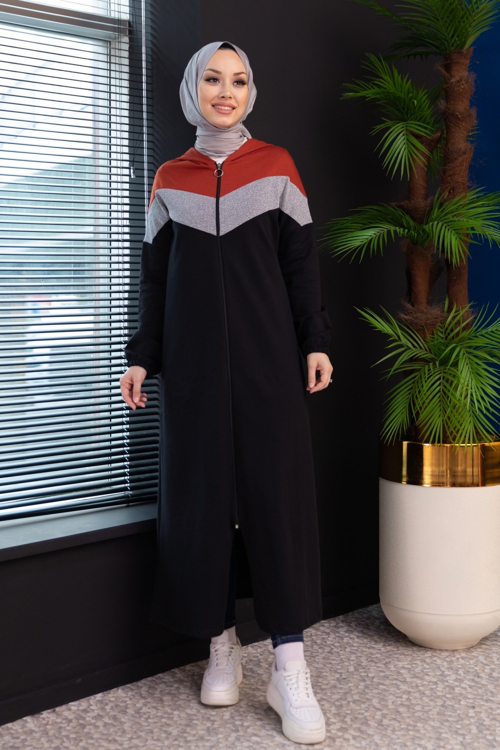 Cardigan long a capuche avec partie argentee - Robe zippee style moderne pour femme voilee - Couleur noir et brique