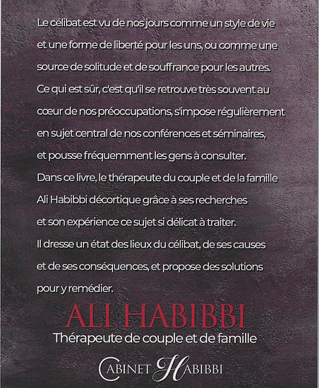 Le célibat est vu de nos jours comme un style de vie et une forme de liberté pour les uns,une source de solitude et de souffrance pour les autres. Ce qui est sûr, c'est qu'il se retrouve très souvent au cœur de nos préoccupations, s'impose régulièrement comme sujet central de nos conférences et séminaires, et pousse fréquemment les gens à consulter. Dans ce livre, le thérapeute du couple et de la famille Ali Habibbi décortique grâce à ses recherches et son expérience ce sujet si délicat à traiter. Il dresse un état des lieux du célibat dans la communauté musulmane,évoque ses causes et de ses effets, et propose des solutions pour y remédier.