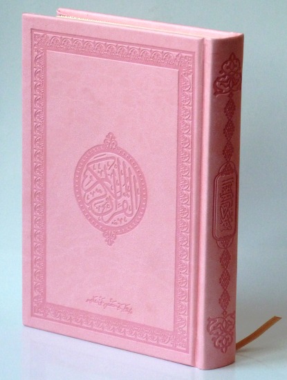 Coran de luxe avec couverture rose claire de type cuir de luxe (PU), très doux au toucher, agréable et ne ramasse pas la poussière.