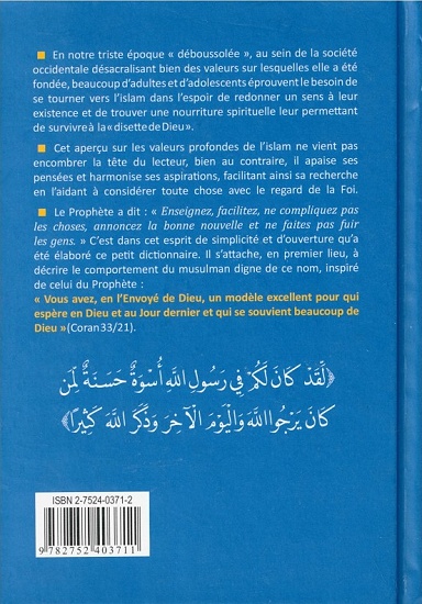 Le Prophète a dit : « Enseignez, facilitez, ne compliquez pas les choses, annoncez la bonne nouvelle et ne faites pas fuir les gens. » C’est dans cet esprit de simplicité et d’ouverture qu’a été élaboré ce petit dictionnaire. Il s’attache, en premier lieu, à décrire le comportement du musulman digne de ce nom, inspiré de celui du Prophète : « Vous avez, en l’Envoyé de Dieu, un modèle excellent pour qui espère en Dieu et au Jour dernier et qui se souvient beaucoup de Dieu » (Coran 33/21).