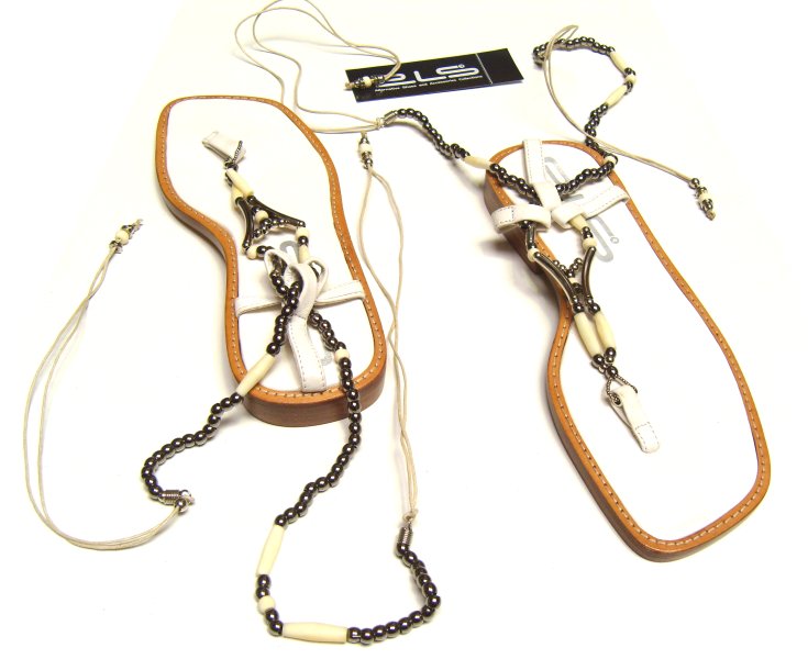 Élégante jusqu'au bout du pied, avec les sandales entre-doigts orné de bijoux magnifiques, en véritables cuir pour les talons et dessous. Modèle unique de haute qualité (cousu). Fourni avec sacoche de voyage.