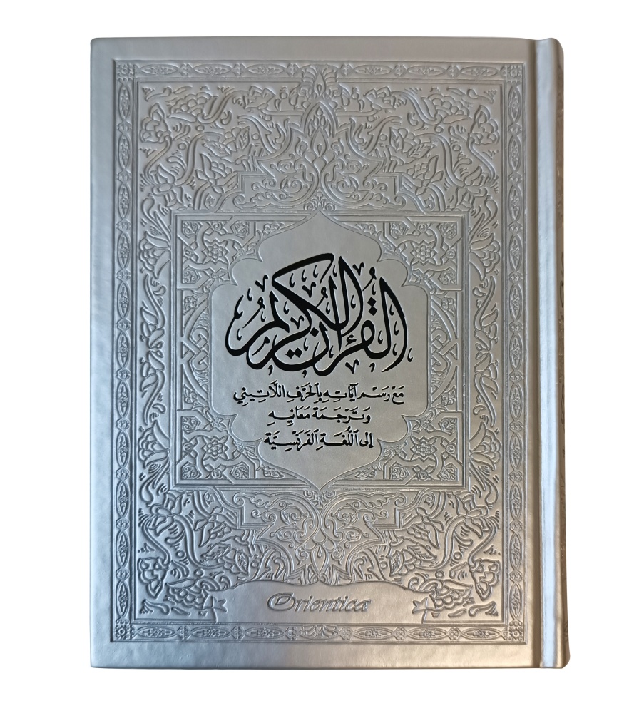 Magnifique Coran avec couverture cartonnée de type cuir argenté. Idéal pour offrir.